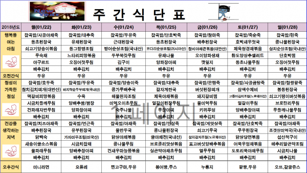 1월 넷째주 식단표 페이지 정보 작성자 영양사 작성일18-01-22 17:54 조회173회 댓글0건 관련링크 본문 1월 22일 ~1월 28일 댓글목록 등록된 댓글이 없습니다. 이전글 다음글 목록