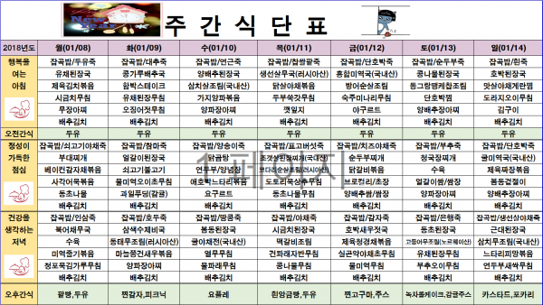 1월 둘째주 식단표 페이지 정보 작성자 영양사 작성일18-01-22 17:52 조회236회 댓글0건 관련링크 본문 1월 8일 ~1월 14일 댓글목록 등록된 댓글이 없습니다. 이전글 다음글 목록
